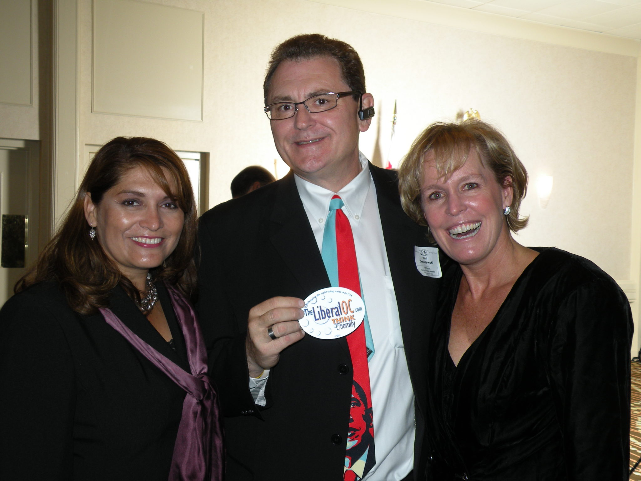 VIP suite Fullerton’s Sharon Quirk (left) and Pam Keller (right) flank Liberal OC editor Dan Chmielewski (c) 2009, TheLiberalOC.com