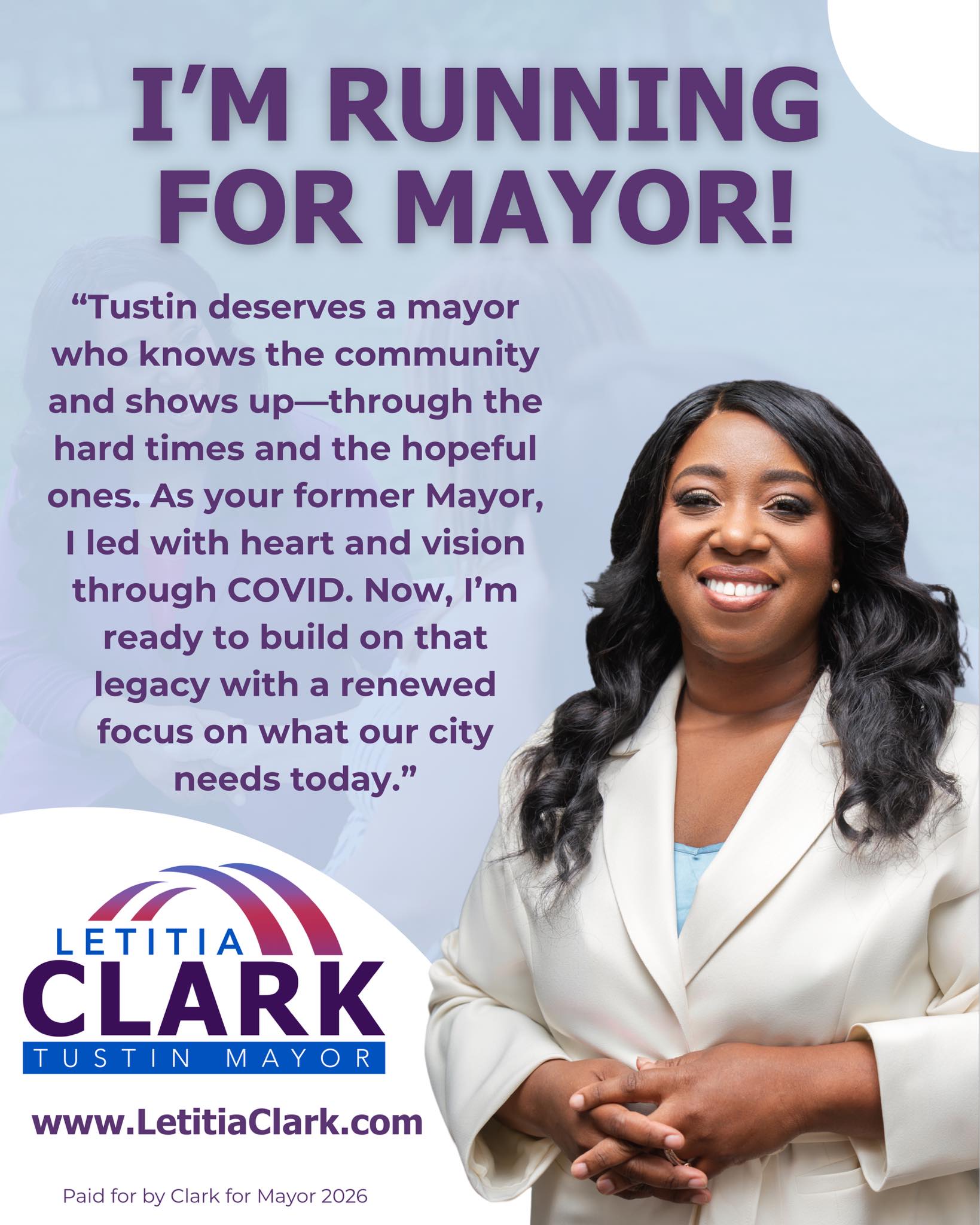 Former Tustin Mayor and Council Member Letitia Clark has announced she’s jumping back into Tustin politics and has announced a new run for Mayor.
