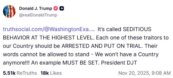 Since six Democratic lawmakers recorded a video warning our armed forces that they can ignore unlawful orders, President Trump and his minions are crying foul, claiming sedition (it’s like January 6th never happened). These former military members, now electeds, did not tell the military to ignore lawful orders, just unlawful ones which is something our armed forces reinforces during basic training.