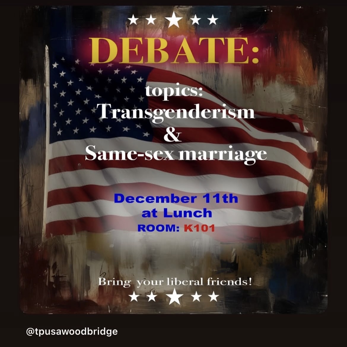 The Turning Point USA club at Woodbridge High School has organized a debate on “transgenderism and same sex marriage”. Not only are people’s lives and identities not up for debate, but this is also dangerous, thinly veiled bigotry that threatens the safety of queer WHS students.