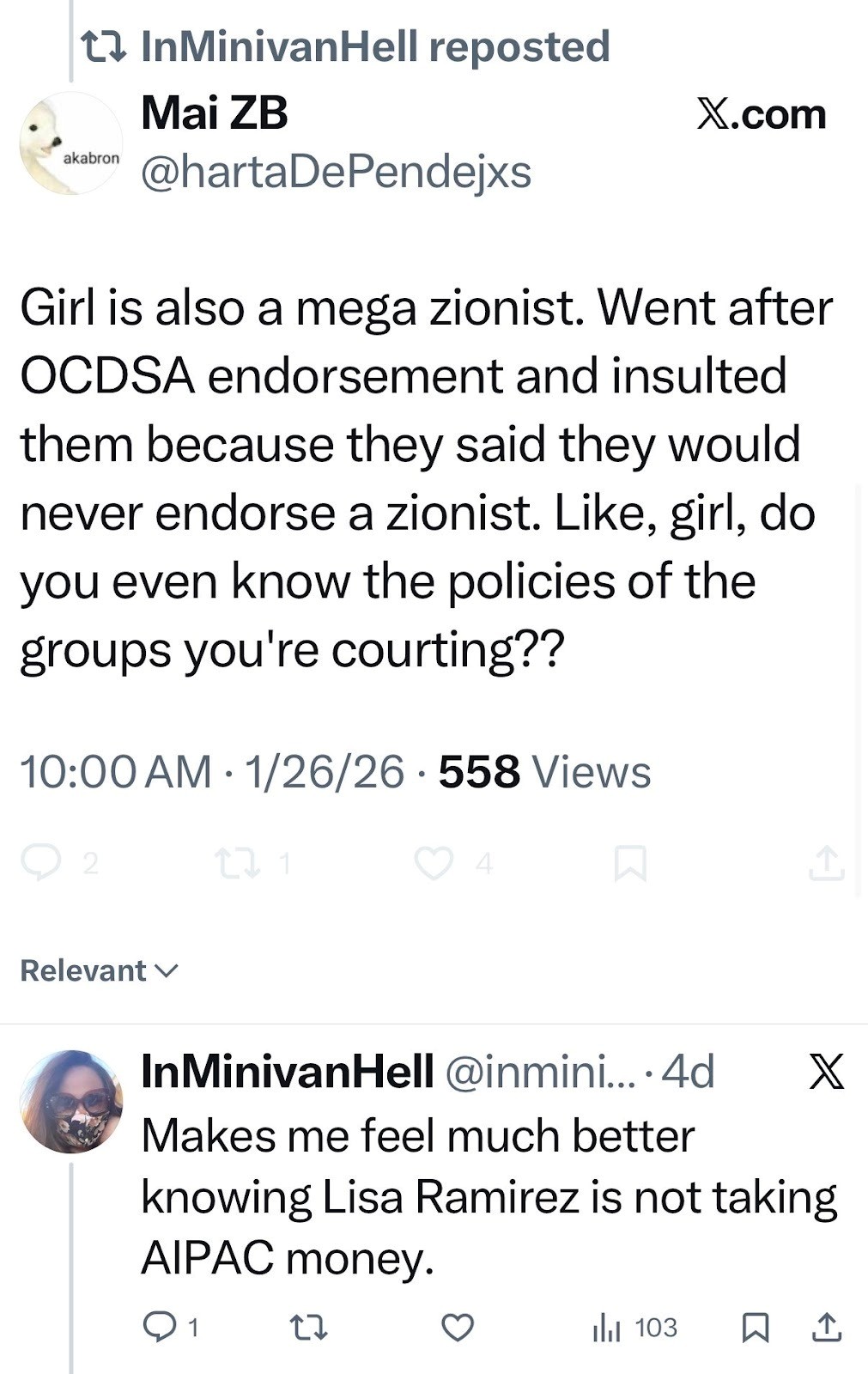 The same day, Walker reposted an antisemitic attack on Kim-Varet from an X account that Walker’s account frequently interacts with, seeking to discredit Kim-Varet, whose husband and children are Jewish, as a “mega zionist”. Walker replied to her own repost, praising Ramirez for “not taking AIPAC money.” AIPAC has neither endorsed nor contributed to Kim-Varet nor any other Democratic candidate in the CA-40 race.