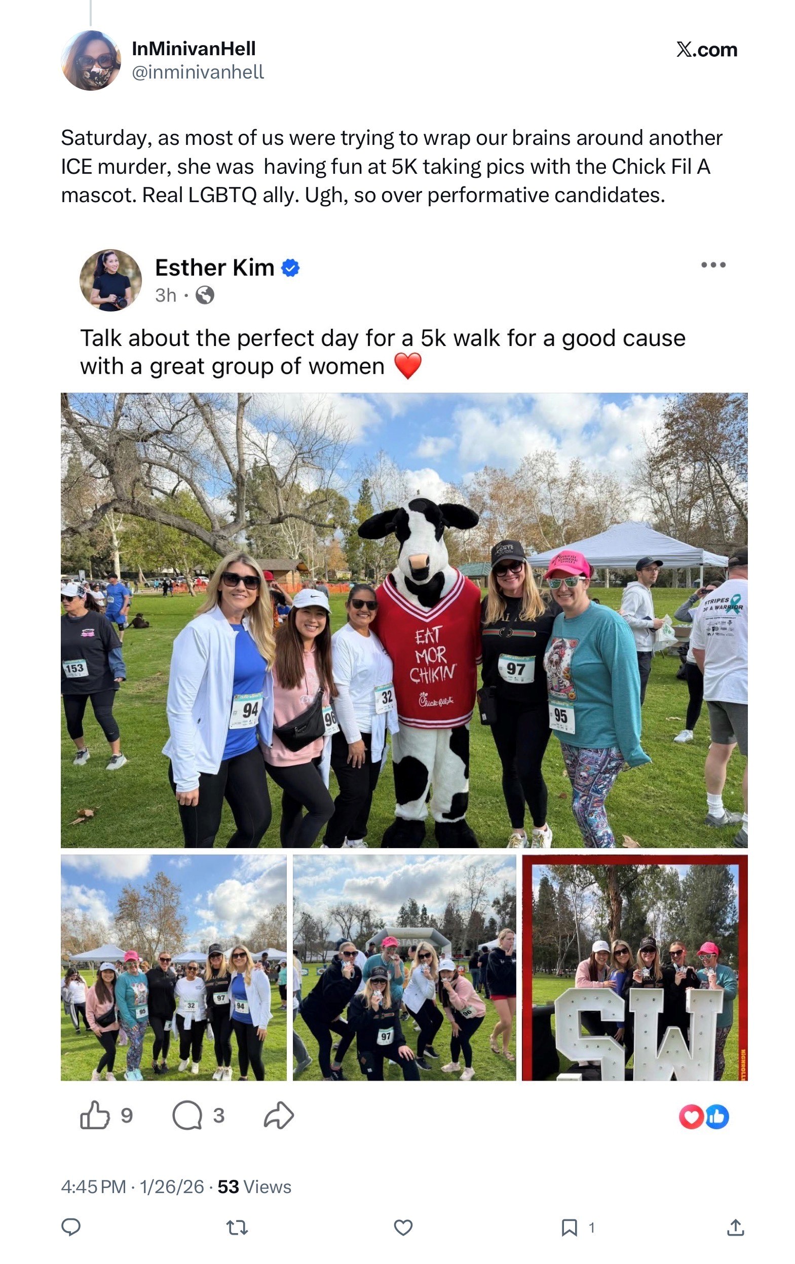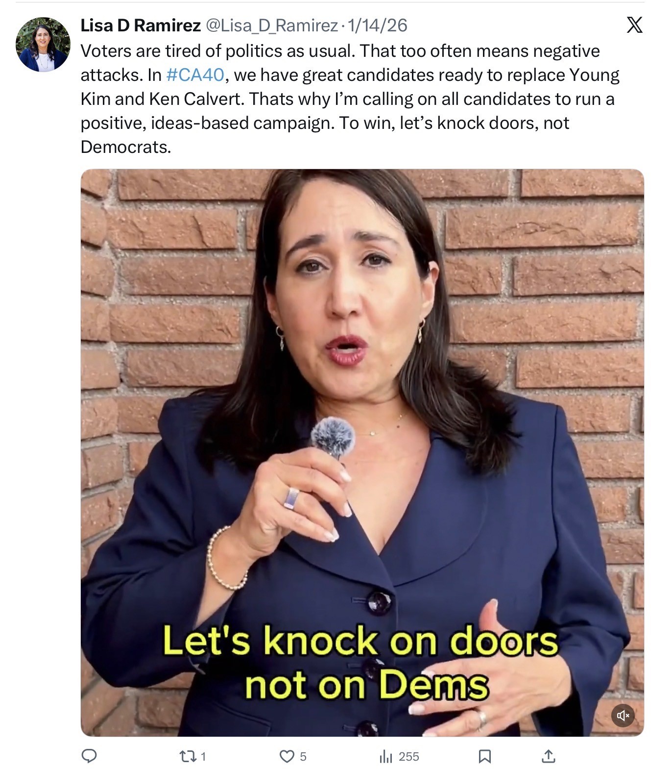 • In mid-January, she called for people to stop knocking other Democrats running for Congress in CA40 — so no gong after Joe Kerr or Esther Kim-Varet;and on her Twitter/X.com account, she hasn’t.  However, she hired Briana Walker a.k.a. “InMiniVanHell” on X.com as a social media/communications consultant.  And Walker, who called Joe Kerr a Republican cos-playing as a Democrat in 2024, has focused her ire on Kim-Varete with attacks on Kim-Varet’s Coto de Caza home and even posting a tweet (non-deleted) criticzing anothe Esther Kim for participating in a community 5K with a mascot from Chick-Fil-A suggesting this Kim was an ally for the LGBTQ community.  The problem with that — it’s not the Esther Kim-Varet running for Congress.  Because all Asian women look alike, right? (Ran that joke by three Asian women who said that phrase before I did and approved it).  Walker seems to get hired by Congressional candidates who live outside the district they run for as her last paid gig was for Joanna Weiss who lost a primary to Dave Min.  And should she criticise Varet-Kim for moving into the district to run for Congress, it’s exactly what Weiss did when she rented a Newport Beach condo for Xmas 2023.  Unlike her work for the Weiss campaign, Walker has not discosed her paid relationship with Rameriz on her Twitter/X.com fed which isn’t illegal but is certainly unethical.  And Rameriz needs to take responsibility for the smack-talking tweets after she posted about knocking on doors , not Democrats.