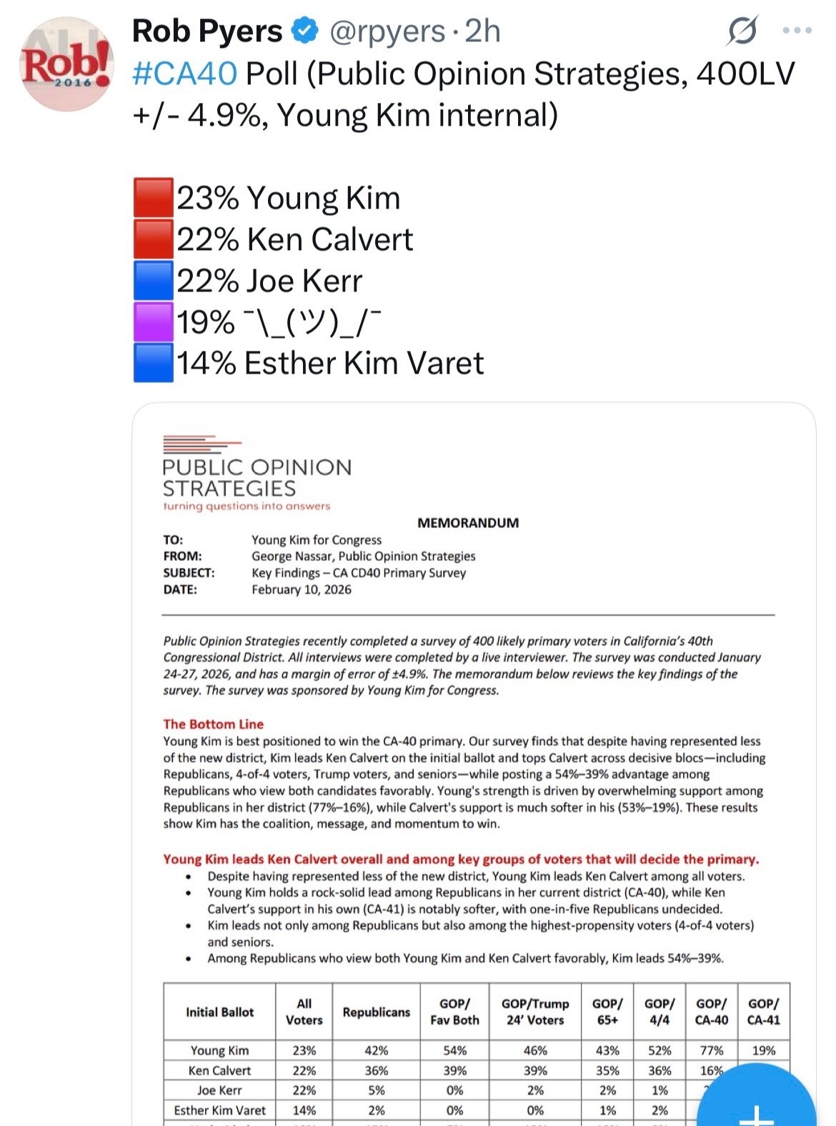 I’m told there are still efforts to convince Young Kim to try and challenge either Dave Min or Derek Tran to stay in Congress, or encourage President Trump to offer Kim an ambassadorship in order to clear the field for Rep. Ken Calvert.  So to demonstrate her viability, Kim’s campaign team has released a poll showing that voters prefer her to Calvert.  The unintended news revealed that Joe Kerr, who cut deeply into Kim’s vote in 2024 compared to 2022, leads the Democratic field.  The survey, conducted by Public Opinion Strategies, shows Kerr and Calvert are tied for the number two spot.