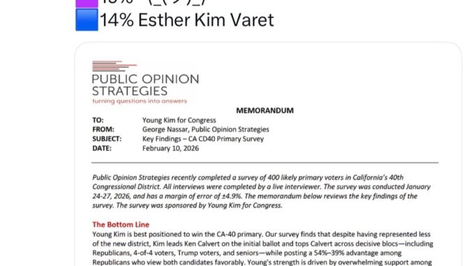 I’m told there are still efforts to convince Young Kim to try and challenge either Dave Min or Derek Tran to stay in Congress, or encourage President Trump to offer Kim an ambassadorship in order to clear the field for Rep. Ken Calvert.  So to demonstrate her viability, Kim’s campaign team has released a poll showing that voters prefer her to Calvert.  The unintended news revealed that Joe Kerr, who cut deeply into Kim’s vote in 2024 compared to 2022, leads the Democratic field.  The survey, conducted by Public Opinion Strategies, shows Kerr and Calvert are tied for the number two spot.
