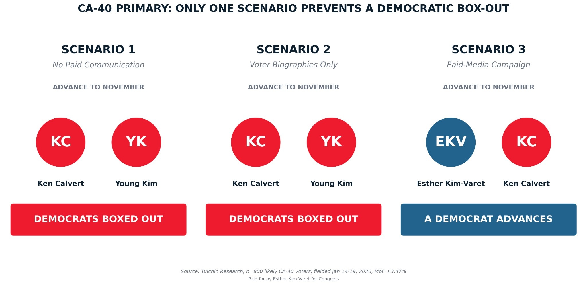 Tulchin’s poll tested three primary scenarios. In two of them, both Ken Calvert and Young Kim advance to the general election, with Democrats boxed out of a must-win seat. In the third scenario, Esther Kim-Varet advances to face Ken Calvert in the general election. The Esther Kim-Varet campaign is the only campaign to have the resources needed to execute an actual paid communication campaign and advance to the general campaign.