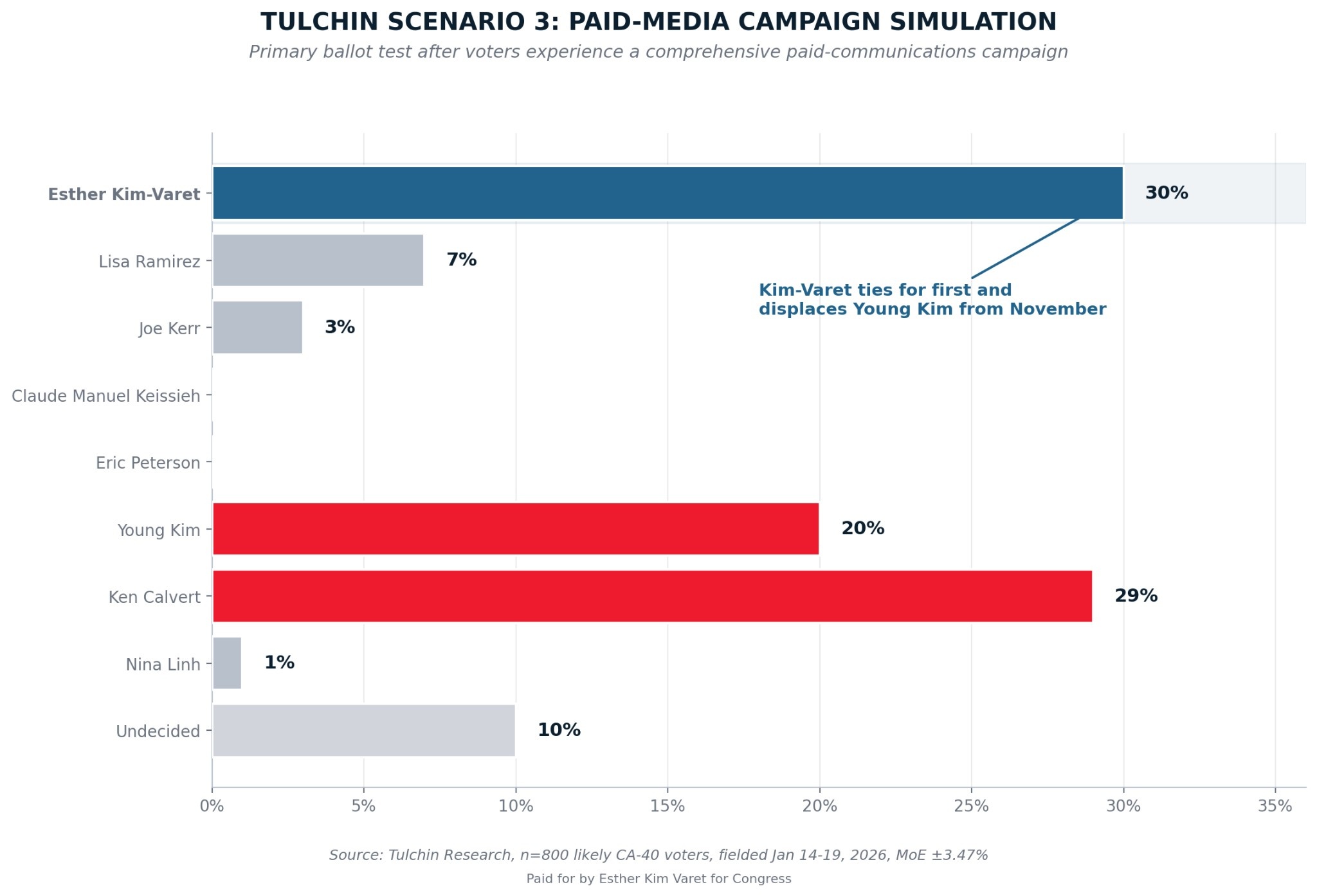 Scenario 3: Esther Kim-Varet is the only challenger candidate with a paid-media campaign, communicating her bio and messaging to likely primary voters. Kim-Varet rises to get 30% of the vote. Calvert is statistically tied with Kim-Varet for first place at 29%. Young Kim collapses to 20% and is displaced from November, outside the margin of error. This is the only scenario per the poll in which any Democrat makes the November ballot, and this is the exact scenario now playing out in CA-40. Kim-Varet is the only Democrat in the race with a paid media campaign or the resources to deploy one.